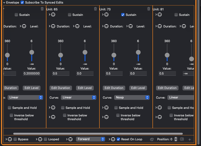 Envelopes can be looped – set the Looped checkbox. Looped envelopes, when executing the final defined stage, will treat the first defined stage as next when executing in the forward direction. If running backwards, the stage following the first defined stage will be the last defined stage, and for each stage, the defined ending point of the previous stage will be the target of the currently-executing stage. Envelopes can run backward, even if not looped – leave the Looped checkbox unchecked, and set the Direction dropdown to Backward or Backward-Then-Forward.