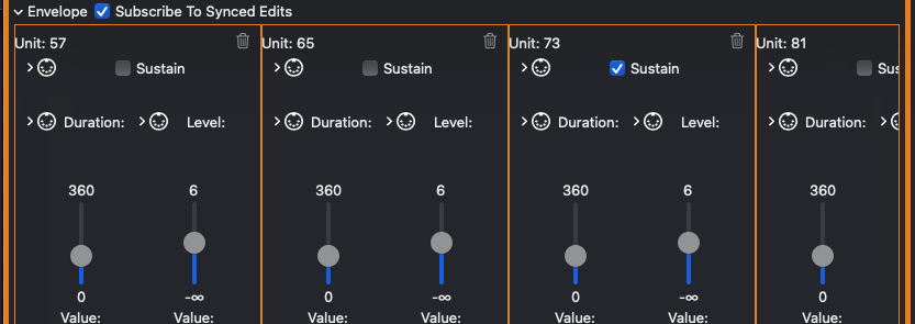 To automatically sync envelope edits, select the types of envelopes you would like to sync from the Sync Envelope Edits checkboxes in Patch settings (system-level envelopes have their own set of settings, in the system-level panel). A new patch does not sync any edits. You can opt-in amplitude envelopes, frequency ramps, and/or value ramps at any point during patch editing — all edits from the point of opt-in are synced. Envelopes can individually subscribe or unsubscribe to synced edits — each envelope has a Subscribe to Synced Edits checkbox at the top of the envelope view.