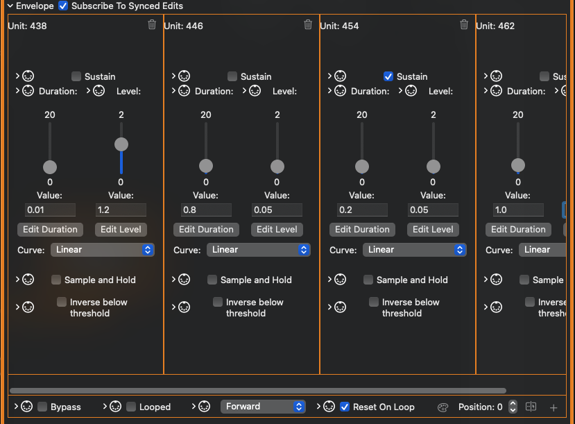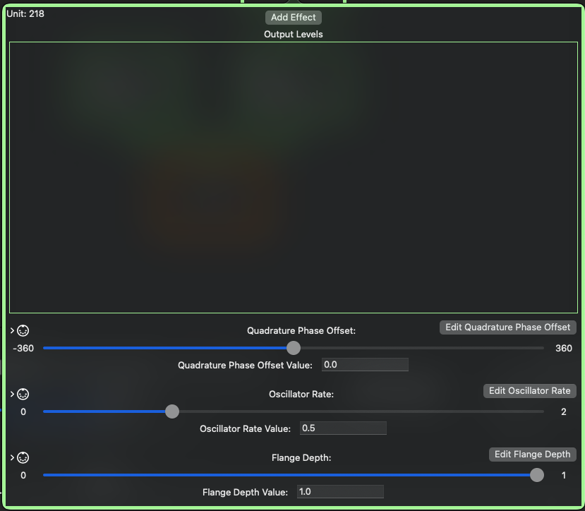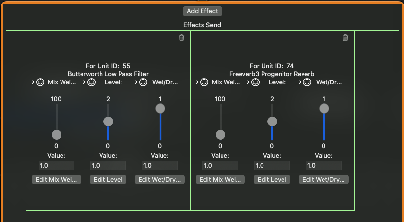 Each object which supports an effects chain, including effects themselves, contains an array of settings panels for each effect wired to it. The settings contain the following sliders to control how the effect is applied: