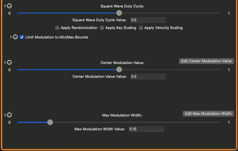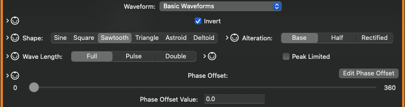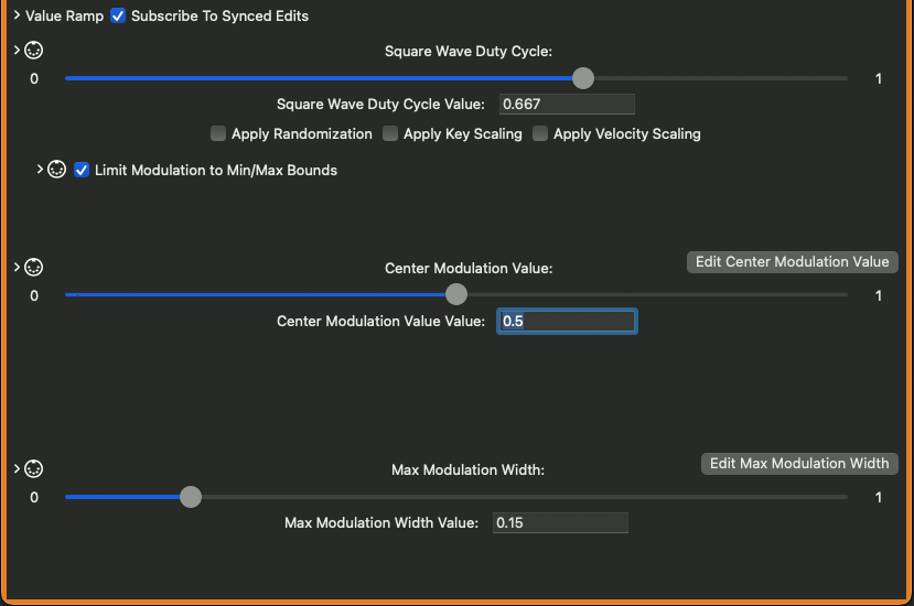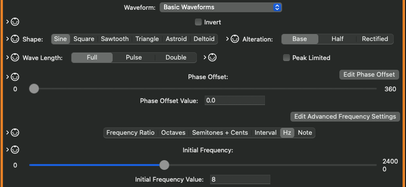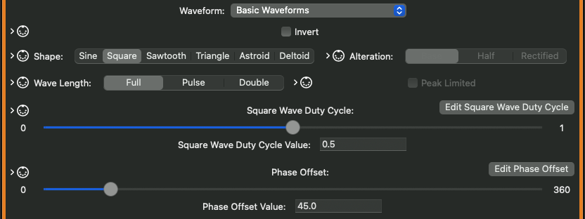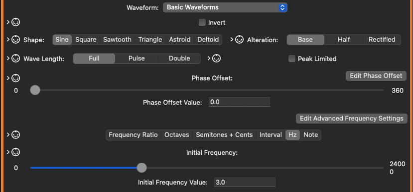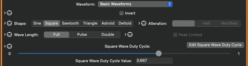 For the second waveform, which is the sum of the sawtooth and 2nd square wave, the modulation can be accomplished entirely through modulating the square wave’s duty cycle parameter – nothing needs to be added to the sawtooth wave. Click the Edit Duty Cycle button, add an oscillator (and leave the waveform as Sine), but set the frequency to 3 Hz (it is slower). Max Modulation Width here is also set to 0.15.