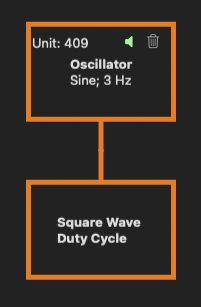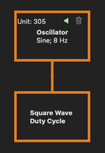 Now to apply Pulse Width Modulation. The simplest way to accomplish that in the Isle I-1 is to directly modulate the wave’s duty cycle parameter. For the first wave, the square wave with the 2:1 duty cycle, click the Edit Square Wave Duty Cycle button, then add an oscillator, and leave its wave generator set to Sine. Adjusting by ear, I can match the timbre by setting the oscillator’s frequency to 8 Hz, then clicking the Duty Cycle box, setting Max Modulation Width to 0.15.