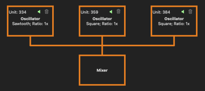 In each spot, managing the effects chain is basically an identical process – a panel containing a diagram of the entire effects chain of an operator is presented, with the operator (such as the Mixer) at the bottom of the diagram. Effects are processed according to the flow of the diagram – from the operator, upward to each effect wired directly to that operator, and continually upward through each effect wired in series. The sum of the output of each leaf of the diagram goes to the operator’s output, such as audio output for a Patch’s Mixer.