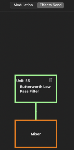 We now have a wave form which is pretty rich in overtones, although it’s too bright to sound like a plucked string. We can dull the sound a bit by filtering out, or subtracting, higher frequencies. Click the Effects Send tab at the top of the Patch Edit view, and you will see the Mixer, with no effects added. Change that by adding a Butterworth Low Pass Filter. The example retains a somewhat bright sound – keep the cutoff frequency set to a frequency ratio of 1.0 (the cutoff frequency will be the same as the note played), and set the Slope parameter to -6 dB, to roll off the higher frequencies a little more gradually and keep some brightness without overpowering.